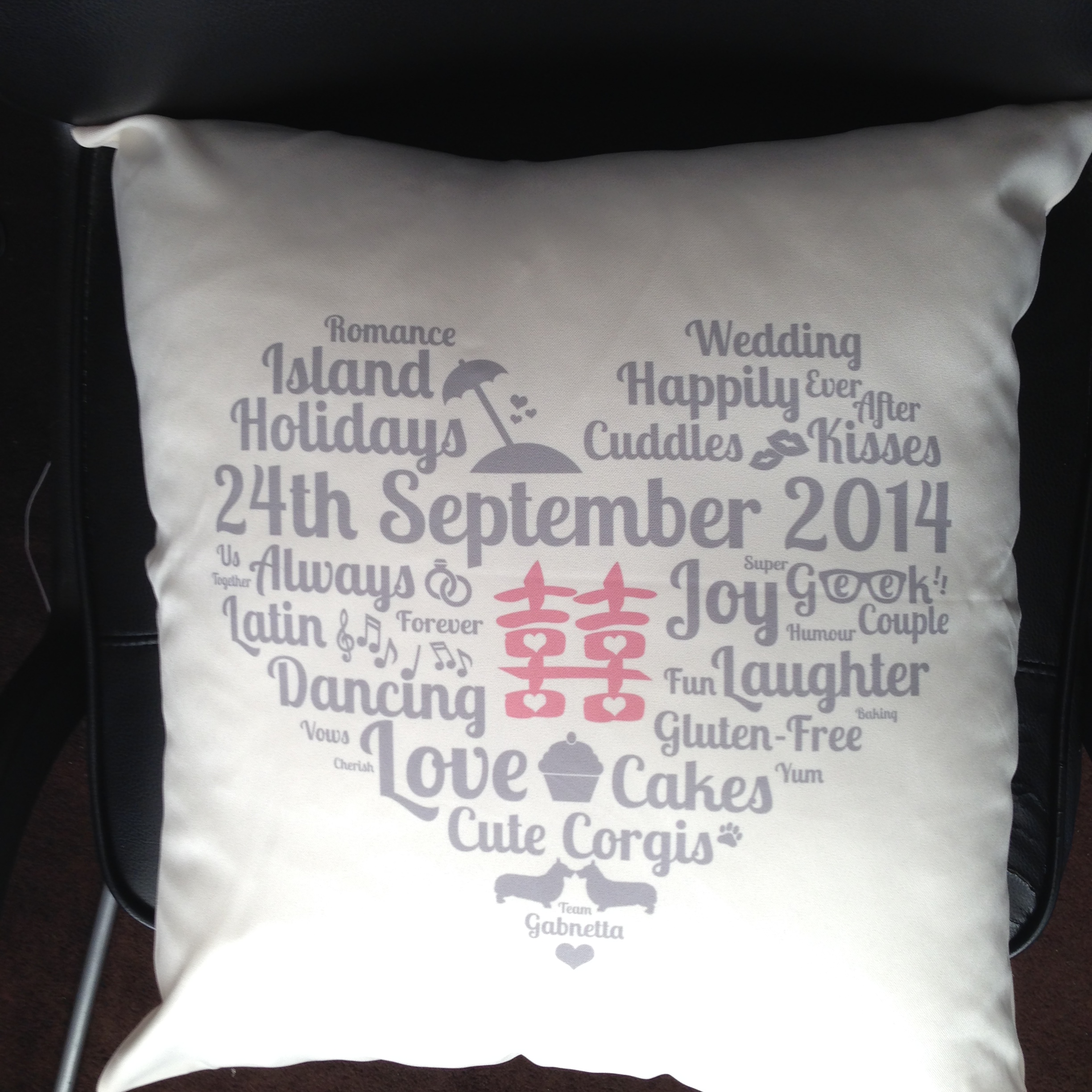Once my Scrabble gift was complete, I realised that the tiles obscured quite a bit of my ‘heart’ word cloud, which seemed a shame, so I ended up submitting the image to TShirt Studio to get a matching cushion printed. Now I was faced with the conundrum of taking two not-exactly-small presents on board a plane and ensuring that both got out the other side unscathed.
