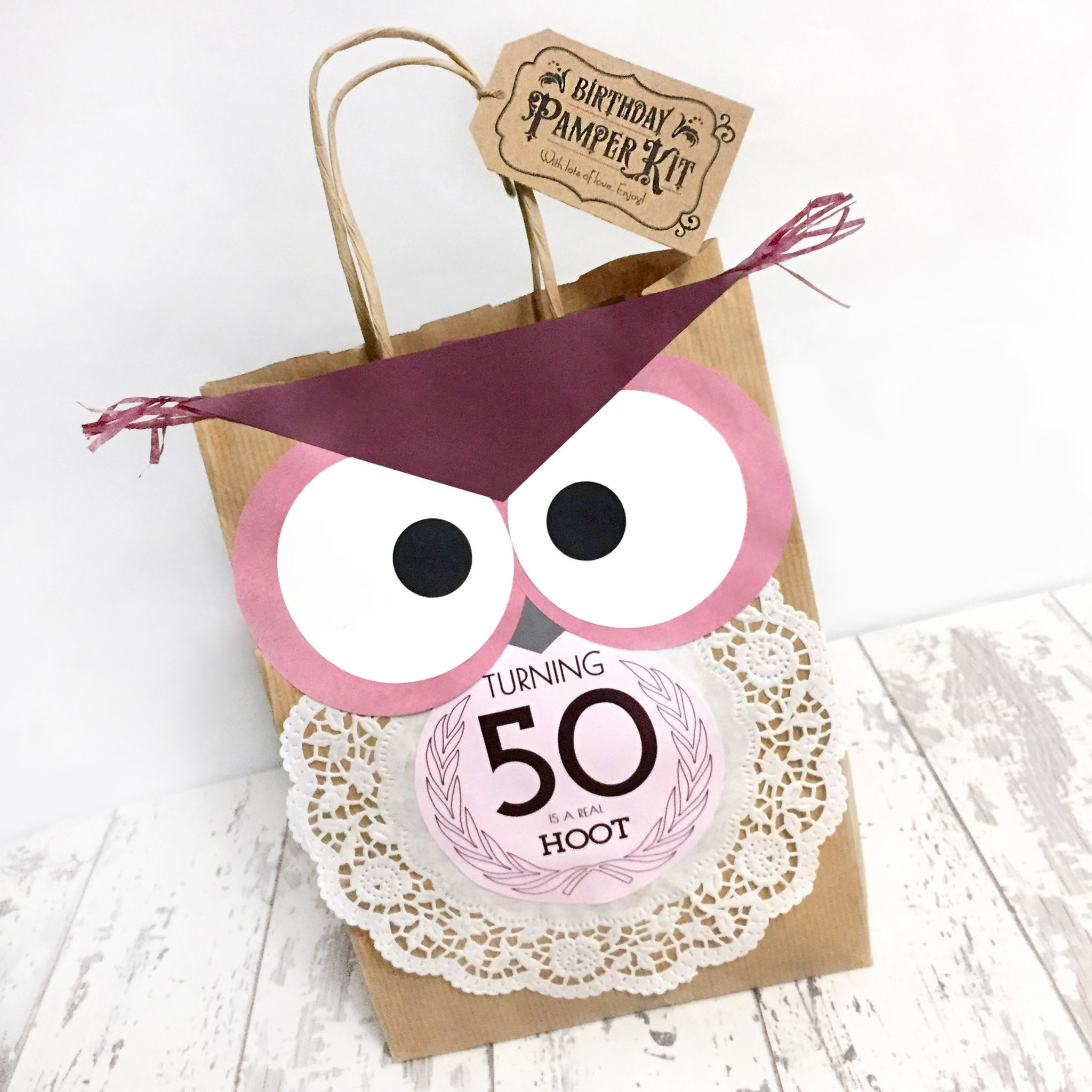 To construct this, all you would need (apart from the bag itself) is a paper doily, some thin card, and gift tissue. Unless you’ve a deft hand, I’d advise cutting the eye-shapes etc. with a circle cutter. I designed a ‘badge’ for the body of the owl that says “turning 50 is a real hoot”, but if you haven’t got a printer, a simpler alternative would be to use washi paper, or another material that’s patterned, like gift wrap.